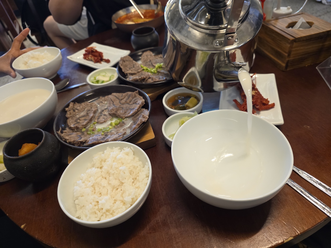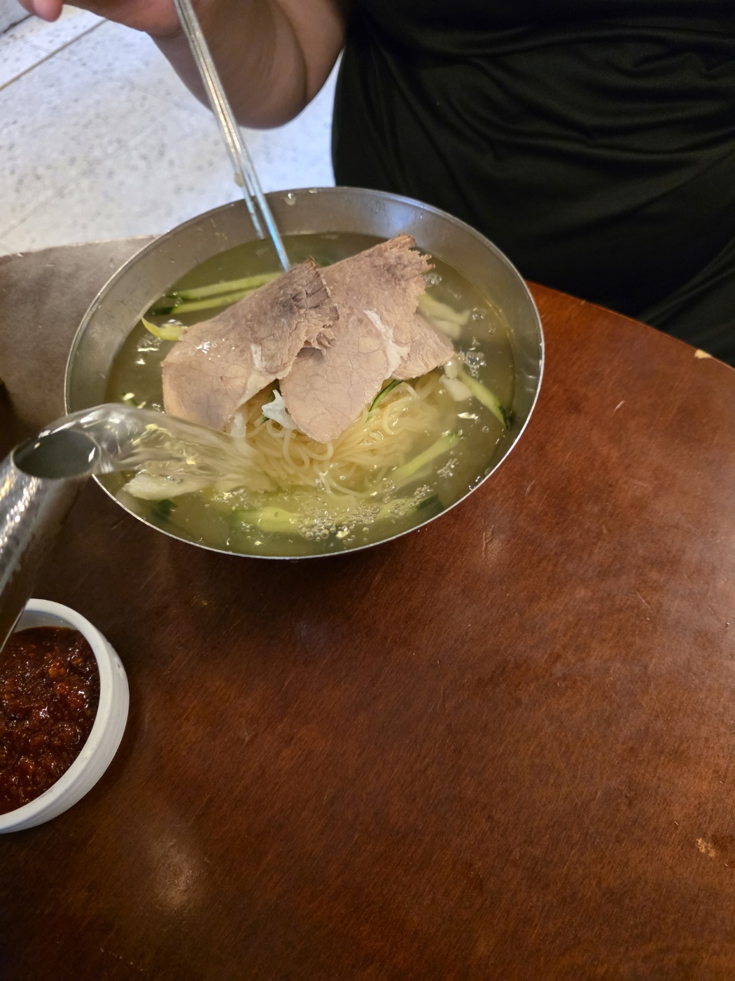 첫 모금에 느껴지는 ‘진짜 사골’의 깊은 풍미는, 단순히 입맛을 돋우는 것을 넘어 식사의 몰입도를 높여줍니다. 밀면이 나오기 전에 육수 한 컵으로 입을 따뜻하게 여는 경험은 평양식 밀면의 차분한 매력을 더해주는 요소이기도 합니다.