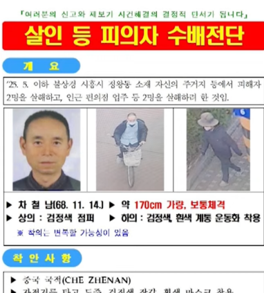 이 사건의 용의자는 차철남(차첸, Che Zhenan), 1968년 11월 14일생, 중국 국적의 57세 남성입니다. 그는 다음과 같은 인상착의를 가지고 있으며, 변복 가능성이 높아 더욱 위험한 상황입니다.