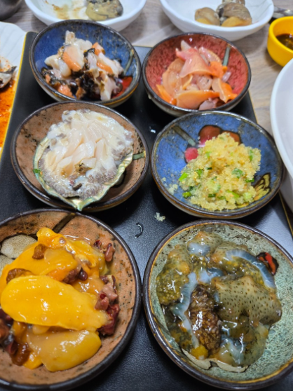 다찌 상차림은 전복죽을 시작으로, 새우구이, 생선조림, 생선구이, 해산물무침 등 약 10가지 이상의 해산물 요리가 정갈하게 제공됩니다.